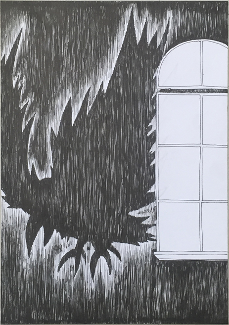 Die Hauptbotschaft einer ganzen Geschichte in nur einer Illustration darstellen. In der Geschichte ging es um einen kleinen Jungen, der in jeder Nacht den Schatten eines Vogels an seiner Zimmerwand wahrnahm. Seine Eltern lies das Ganze völlig kalt und er war mit seiner Angst komplett allein. Ich habe versucht das Düstere und das, was der Junge in dieser Zeit empfand in einer Zeichnung darzustellen.